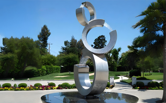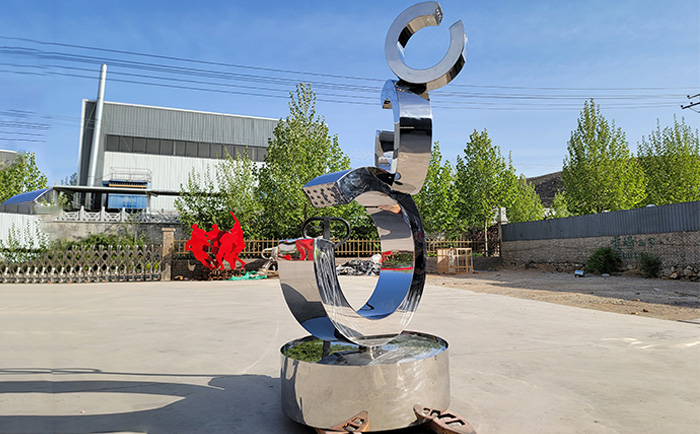 不銹鋼材質(zhì)賦予了雕塑現(xiàn)代感與時(shí)尚氣息,其光滑的表面能完美地反射周圍的環(huán)境與光影,當(dāng)噴泉開啟,水流與光影相互交織,在不同的時(shí)段、不同的天氣條件下,呈現(xiàn)出千變?nèi)f化的視覺(jué)效果。白天,陽(yáng)光灑在水面與雕塑上,閃耀著金色的光芒;夜晚,配合精心設(shè)計(jì)的燈光,噴泉雕塑又成為夜空中最璀璨的存在,為城市的夜景增添了一份浪漫與神秘。